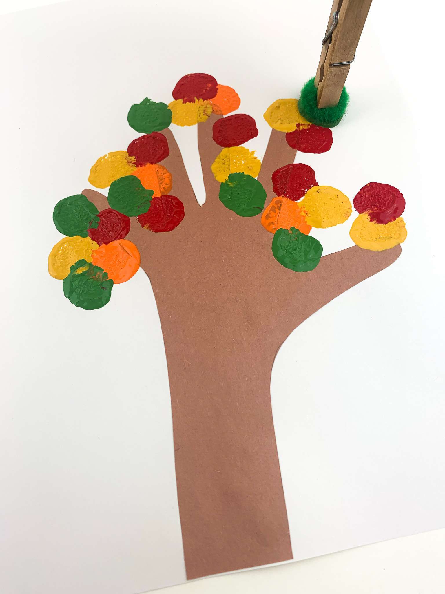 Fall Handprint Tree Craft (Painting With Pom Poms) A paper craft depicting a tree with a brown trunk and colorful circle leaves in red, yellow, orange, and green. A clothespin with a green pom-pom is attached to the top right of the paper.